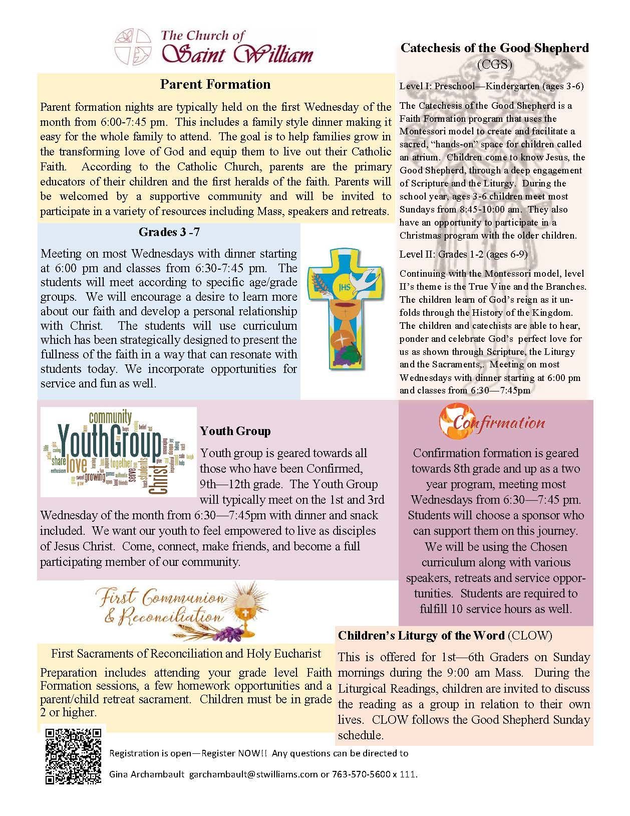 The Church of St. William offers faith formation for all ages, from youth to adult.